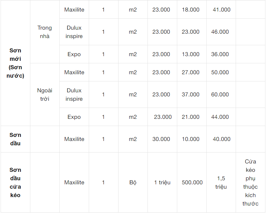 Tham khảo bảng giá sơn nhà của Công ty Xây dựng Thăng Tiến năm 2024 tại đây: