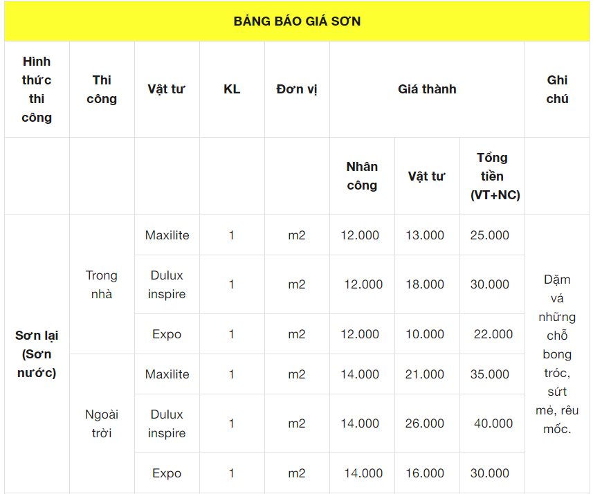 BẢNG BÁO GIÁ SƠN NHÀ 2024