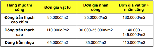 Giá thi công trần thạch cao Xây dựng bê bê tông sẽ giao động từ 110.000đ/m2 - 145.000đ/m2 tùy vào từng hệ trần và đặc điểm công trình thi công (đã bao gồm cả chi phí nhân công). Mọi người có thể tham khảo thêm thông tin tại bảng dưới đây: