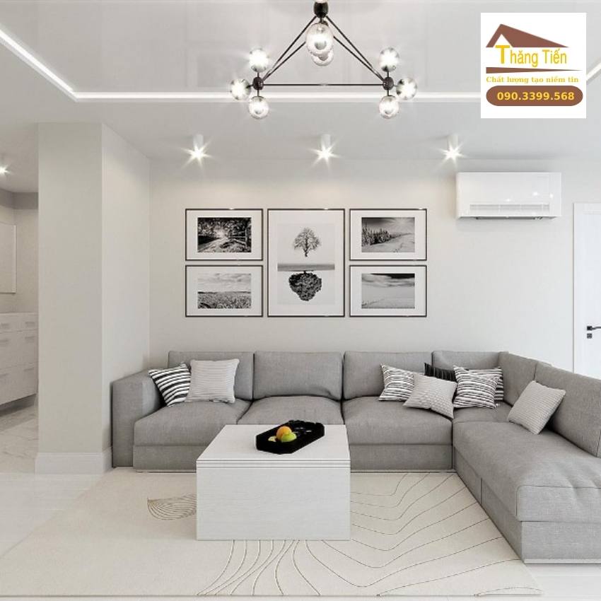 1 trong những công thức sơn màu cho phòng khách không bao giờ lỗi thời đó chính là màu tối giản. Đối với nhiều người, đây là phong cách mờ nhạt và an toàn. Thế nhưng, công ty sửa chữa nhà Thăng Tiến lại không nghĩ như vậy. Khi sử dụng các gam màu tối giản như ghi, xám, trắng,.. thì bạn nên điểm thêm 1 vài màu sắc khác để phòng khách có điểm nhấn hơn. Tuy nhiên việc điểm xuyết này cần thực hiện trên sự đầu tư có kế hoạch. Nếu không phòng khách của bạn sẽ thành 1 trò hề đó nhé!