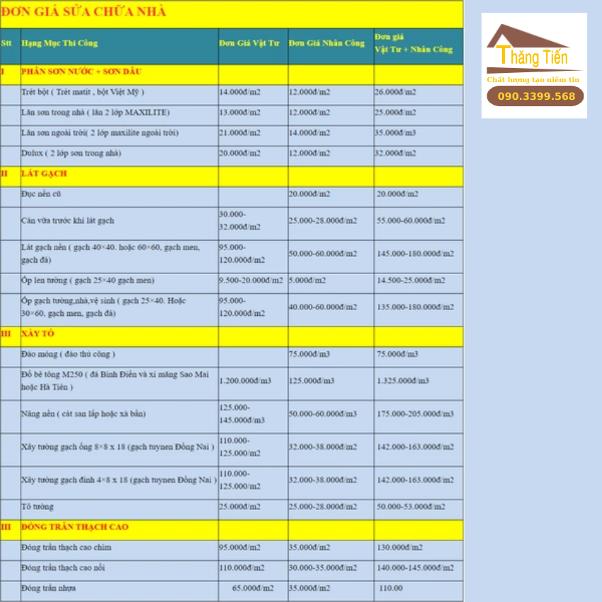 Bảng báo giá dịch vụ sửa nhà tại Xây Dựng Thăng Tiến